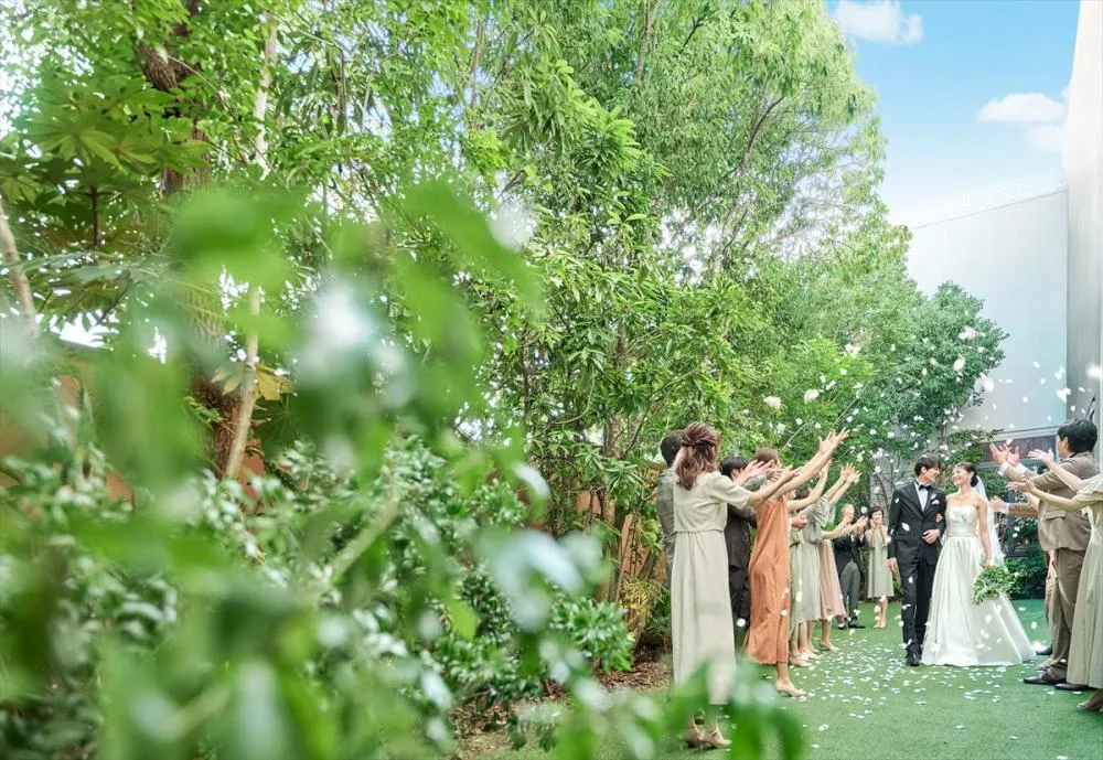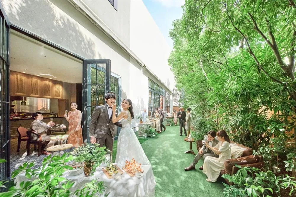 【ガーデンテラス&オープンキッチン併設:2~130名】自然光溢れる明るい雰囲気のパーティ会場。細部までこだわられたインテリアにも注目を!緑豊かなテラスは雨の日でも屋根が出せるので全天候型で安心